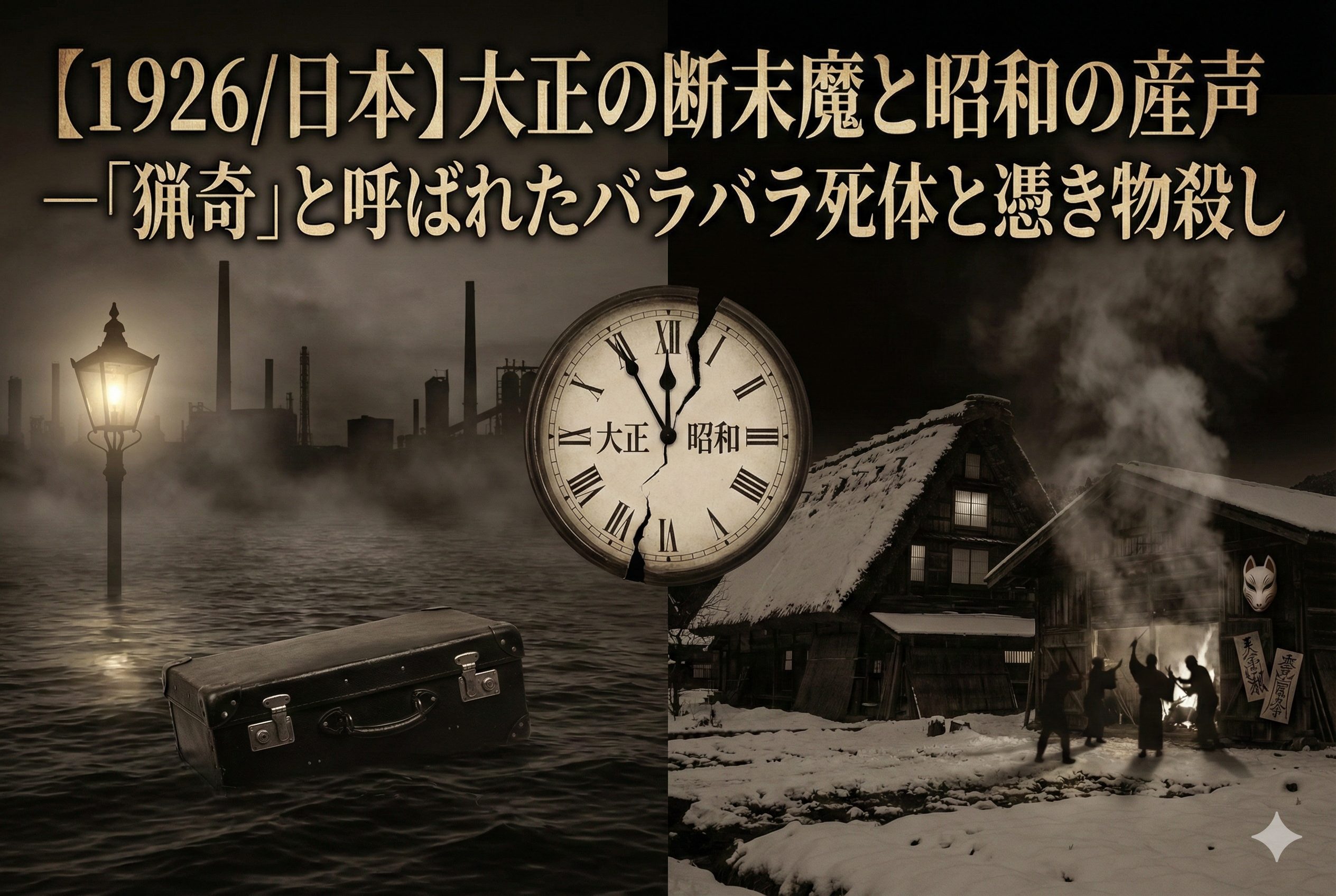 - 概要: 昭和への改元が目前に迫った12月の寒村。ある農家で、19歳の娘が精神に異常をきたし、うわ言を叫び暴れ始めた。 近代医学の知識が届かない閉鎖的な村社会において、家族はこれを「狐(キツネ)が憑いた」と判断。修験者や祈祷師の言葉を信じ、娘を納屋に閉じ込め、松葉を焚いて「狐を燻り出す」という過酷な儀式を行った。 「狐よ、出ろ!」と叫びながら、家族総出で娘を棒で叩き、煙責めにした結果、娘は心不全と窒息により絶命。 都市部では地下鉄が開通しようかという時代に、地方では江戸時代さながらの迷信が人を殺していた。この事件は「開化した日本」の皮を一枚剥げば、そこにはまだ中世の闇が広がっていることを露呈させた。