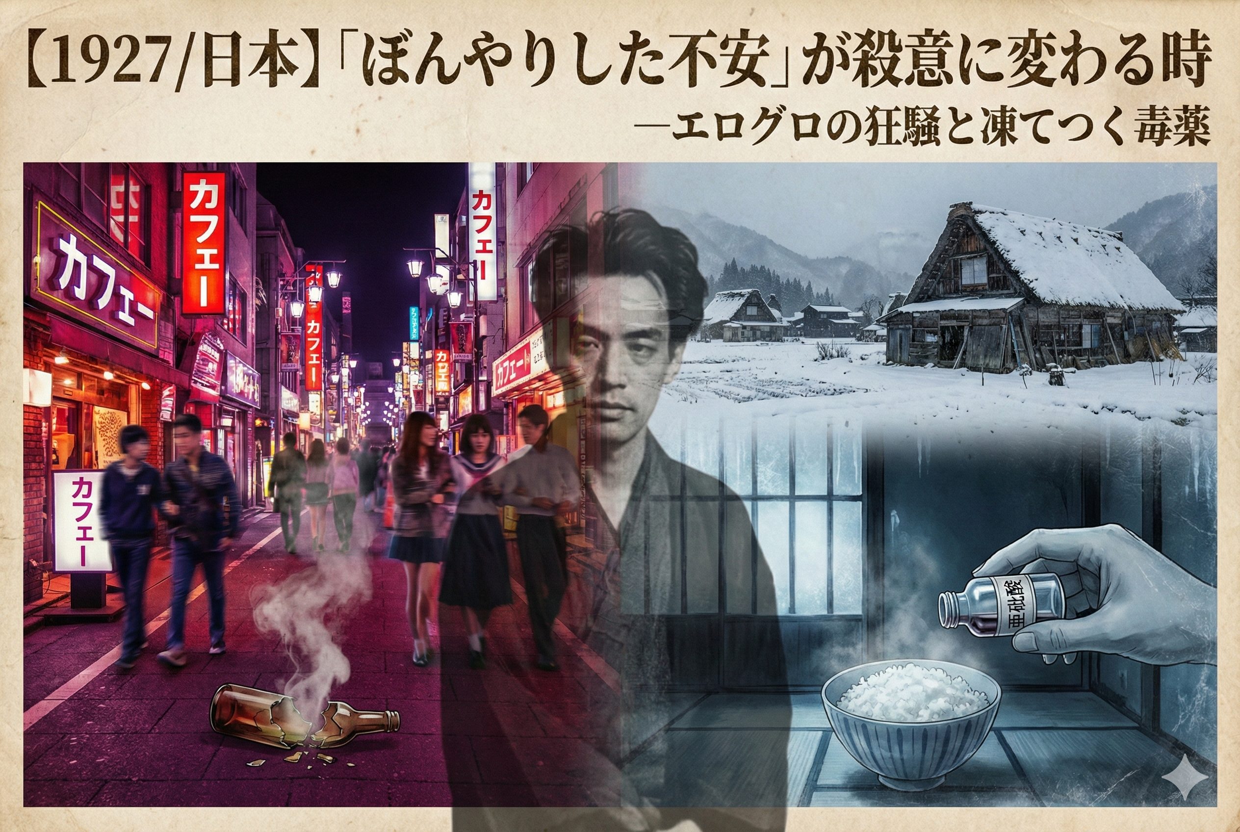 相反する「極貧」と「享楽」が交差したこの半年間には、人間の執着が泥ドロに溶け出したような凄惨な事件が頻発します。今回は、ネオンの影で起きた「顔面溶解殺人」と、雪深い寒村で起きた「冷徹な家族毒殺」という、対照的な二つの事件から昭和2年の闇をプロファイリングします。