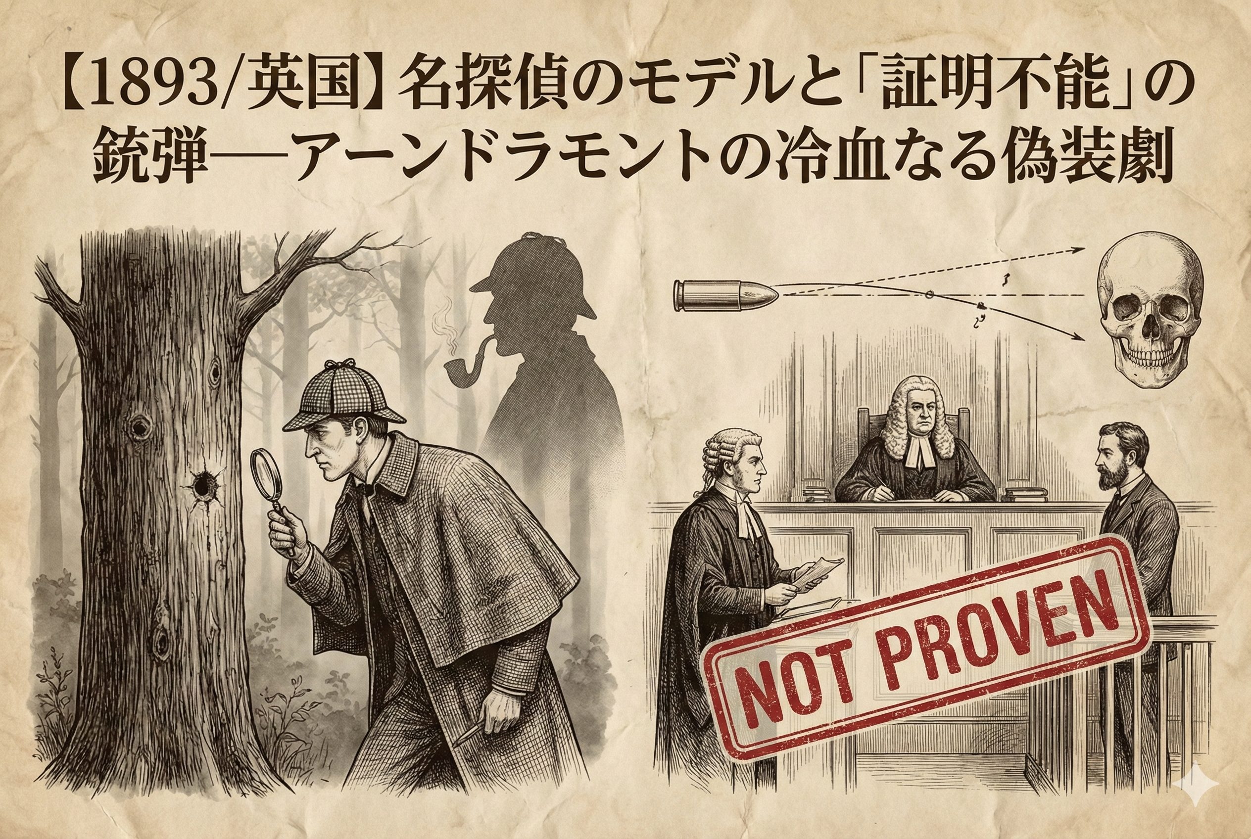 1893年、イギリス。奇しくもこの年、アーサー・コナン・ドイルは自らの生み出した名探偵シャーロック・ホームズを『最後の事件』で滝壺へと葬り去った。しかし現実の霧の都とスコットランドの森では、フィクションを凌駕する冷徹で猟奇的な犯罪が進行していた。今回は、ホームズのモデルとなった実在の法医学者が挑み、そして敗れ去った「完全犯罪」――銃弾と保険金が絡むスコットランドの怪事件「アーンドラモントの謎」を解剖する。